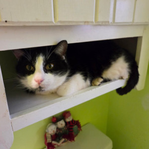 They were just left to fend for themselves. Fortunately a kind hearted neighbor fed them and contacted us. As space became available we took them into our foster program. Joseph does this cute little thing where he will tap you on your arm to say pet me. He really enjoys being petted. He is FIV positive which means his immune system is compromised. Many FIV cats live a full life with yearly vet cat. He does not require any special medicine. He is a sweetheart. He could be contagious to other cats if he bit them. He is a gentle soul and lives with 2 of the other cats that were abandoned and doesn't bother them. He could live with another fiv positive cat or be a one and only.