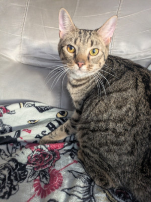 Toffee is a sweet baby boy! He greets his foster mom every morning with an upright tail, perked ears, happy purrs, and eyes full of love! He likes to cuddle on you and play with you. (Feather wands are AWESOME!) As far as food, Churu tubes are his drug of choice. Toffee likes other cats, children, and has shown openness and curiosity with dogs. He is really the purrrfect cat! He just doesn't like to be alone, so he would not do well as an only cat in a house all alone all day long. If you don't already have an animal friend or if you don't work from home, be sure to adopt a friend with him.