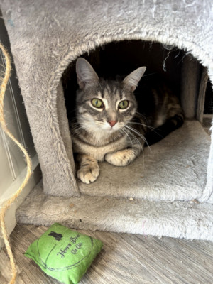 Wolfie is a beautiful gray tabby girl! She was found wandering around at St Mary's college when she was only 4 weeks old. We didn't know where her mother or the rest of the litter was and although we tried to find them, we never did. We gave her the nickname "the lone wolf" and the name stuck.