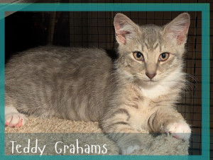 My brother is Cheerio, the buff guy. I'm just me, Teddy! So far I am a sort of quiet young thing who likes when it's calm and you can sit down and pet and brush me. I'm playful and fun, but right now it's a little overwhelming with so many foster kittens that I prefer more one on one time with my person. I get along with everyone and my fur is really pretty and soft. You can't see much from my photos but it's a really pretty gray.