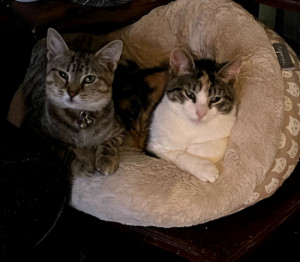 Icy & Tora are a very bonded pair of young cats. Icy is the tabico (tabby/calico mix) and Tora is the brown tabby. Icy is the outgoing one and Tora is a little shy. Their antics are a little strange, but endearing. For example, they like to put their toy springs in the bathtub and play in there. They also find the bathtub the perfect play to wrestle each other.